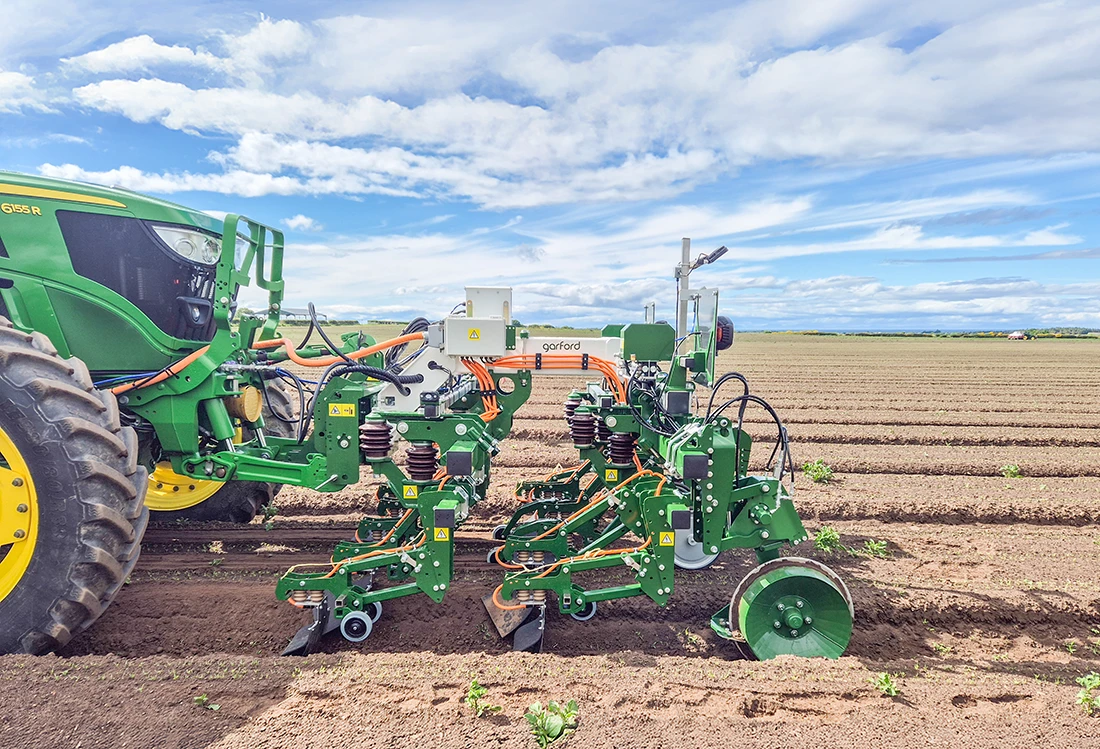 Garford kombiniert seine kameragesteuerte Verschiebetechnik mit der elektrischen Unkrautbekämpfung von RootWave. Das patentierte System arbeitet mit hochfrequentem Wechselstrom.